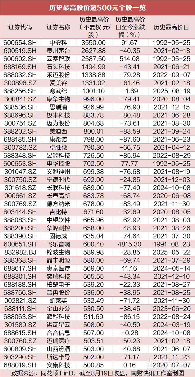 回顾A股千元股历史,上世纪90年代,飞乐股份、真空电子股价均曾站上1000元。1992年1月10日,飞乐股份成为A股历史首只千元股,同年5月25日,盘中涨至3550元(不复权),创下至今未破的最高股价纪录。