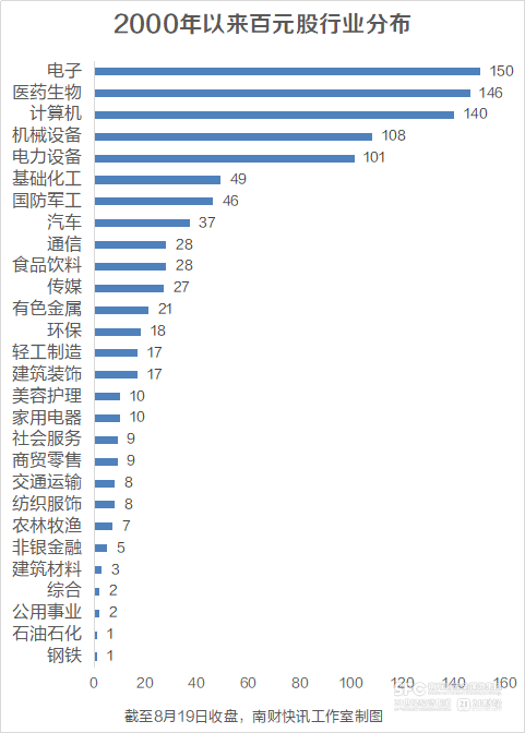据21财经·南财快讯记者统计,截至8月19日,历史最高股价超100元(不复权)的1008只个股中,电子、医药生物、计算机三大行业合计贡献超400只,占比逾四成。其中,电子行业150只,医药生物146只,计算机140只,机械设备、电力设备紧随其后。