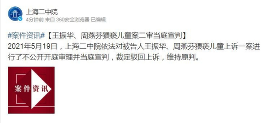2020年6月,媒体从上海市普陀区人民法院获悉,被告人王振华因猥亵儿童罪被判处有期徒刑5年。尽管王振华方面后续提起上诉,请求二审判决无罪,但2021年5月上海二中院依法对该案进行了不公开开庭审理并当庭宣判,裁定驳回上诉,维持原判。
